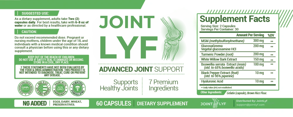 JointLyf is crafted in our certified U.S. facility following strict Good Manufacturing Practices (GMP). Each capsule combines seven ingredients in one comprehensive joint formula. Our quality formula includes select antioxidants, vitamins, and minerals in a precise daily blend. Try JointLyf with confidence – backed by our 60-day money-back guarantee.
